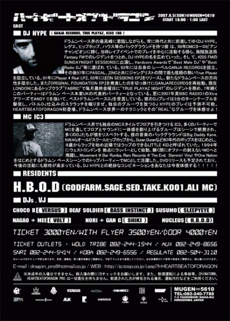「ハートビートオブドラゴン」 2007.8.5(SUN) @MUGEN∞5610 20:00-3:00 LAST ADV:3000yen WIYH FLYER:3500yen DOOR:4000yen -CAST- DJ HYPE [GANJA RECORDS,TRUE PLAYAZ,KISS 100] MC IC3 -RESIDENTS- GODFARM SAGE SED TAKE KOO1 ALI MC VJ NUCLEUS [HEARTBEATOFDRAGON] -DJs- CHOCO B [VERSUS] DEAF SOLDIER [BASS INSTINCT] SUSUMO [SLEEPYEYE] NAGAO+MEE [VOLT] NORI+GAN G [SHIKI] DJ HYPE [GANJA RECORDS,TRUE PLAYAZ,KISS 100] ドラムンベース界の最高峰に君臨しながらも