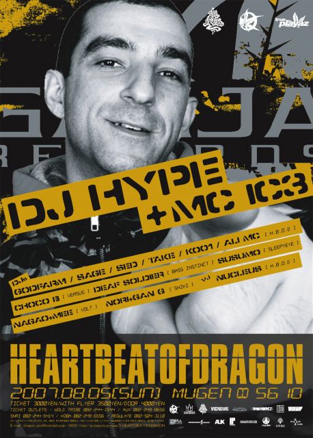 「ハートビートオブドラゴン」 2007.8.5(SUN) @MUGEN∞5610 20:00-3:00 LAST ADV:3000yen WIYH FLYER:3500yen DOOR:4000yen -CAST- DJ HYPE [GANJA RECORDS,TRUE PLAYAZ,KISS 100] MC IC3 -RESIDENTS- GODFARM SAGE SED TAKE KOO1 ALI MC VJ NUCLEUS [HEARTBEATOFDRAGON] -DJs- CHOCO B [VERSUS] DEAF SOLDIER [BASS INSTINCT] SUSUMO [SLEEPYEYE] NAGAO+MEE [VOLT] NORI+GAN G [SHIKI] DJ HYPE [GANJA RECORDS,TRUE PLAYAZ,KISS 100] ドラムンベース界の最高峰に君臨しながらも、