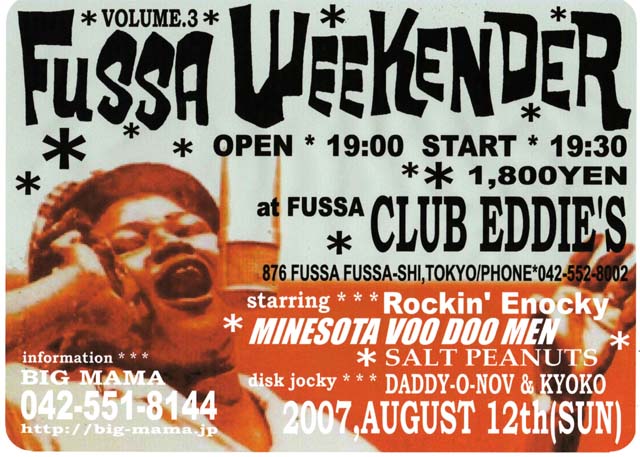 「FUSSA WEEKENDER VOL3」 8月12日(日) 福生 EDDIE'S 876 FUSSA-SHI TOKYO PHONE 042-552-8002 OPEN 7:00 START 7:30 1,800YEN =BAND= ・Rockin'Enocky http://www.geocities.co.jp/MusicStar-Drum/6409/ 日本を代表するサーフバンド 「ジャッキー&ザ・セドリックス」のギター エノッキーSANのワンマンバンド! ・MINESOTA VOO DOO MEN http://minnesotavoodoomen.fc2web.com/index.htm VOL1でもカッコイイステージを見せてくれた ミネソタ・ブゥードゥーメン! ストレートでカッコイイROCK'N ROLLを聞かせてくれます♪