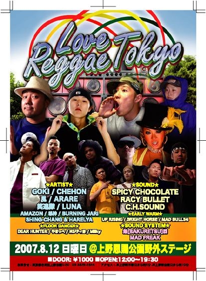 告知させていただきます。 上野(恩賜)公園内にある 水上音楽堂野外ステージを舞台に、 昼間からREGGAEを楽しめる野外ダンス。 野外ダンスなので、IDは必要ありません。 普段仕事で遊びに行けない方や 年齢的に難しい方なども楽しめます。 詳細地図はこちら。 http://map.yahoo.co.jp/pl?lat=35.42.26.004&lon=139.46.26.769&sc=3&mode=map&type=scroll 『LOVE REGGAE TOKYO』 DOOR:\1000 OPEN:12:00〜19:30 -ARTIST- GOKI CHEHON 風 ARARE 笑連隊 LUNA AMAZ