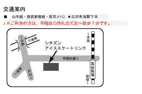 「暑さを吹きとばす夏のアイススケート」と題しまして、昼の暑い時間をクールに過ごすイベントです! クールを通り越してコールドかもしれないのでそこら辺を注意! 日程: 2007年8月12日(日曜日) 時間: 15:00〜 場所: CITIZENアイススケートリンク(高田馬場) 費用: 1500円 貸し靴込み 経験者はもちろん、初めての方も大歓迎です。 ちなみに私はリンクに立てるか怪しいレベルですw 集合場所: 高田馬場駅 早稲田口構内 (改札を出てすぐの場所) 時計が釣り下がっている場所近辺でお願いします。 集合時間: 14:50 徒歩(7