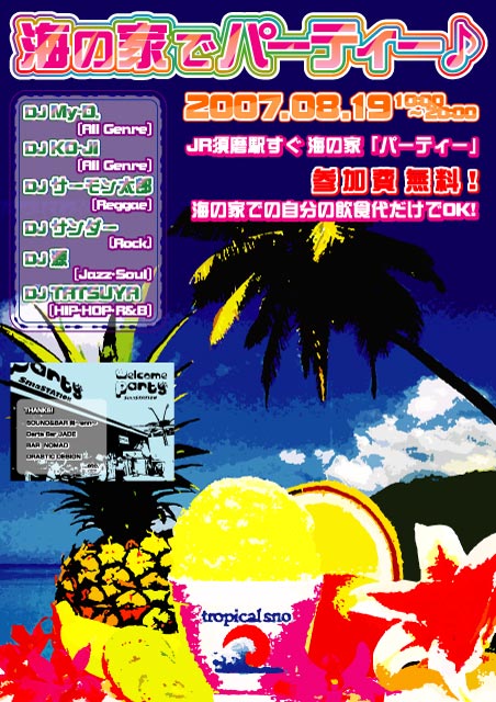 ついにやってきました真夏の一大イベント! 【海の家でパーティー♪】 http://mixi.jp/view_event.pl?id=21699302&&comm_id=712034 【主催】 ■ SOUND&BAR 炎〜enn〜 (大阪・キタ/神山町) コミュ : http://mixi.jp/view_community.pl?id=712034 去年も行われたこのイベントに今回 私たち JADE も参加 させていただく事になった訳で! 素晴らしく素敵な熱ぅ〜〜〜い夏しちゃいましょう♪ このイベントの一番の見せ場!! 海の家を貸しきってのオールジャンル 〜 多岐に亘り いろんなクラブなどで広く活躍している 選りすぐり