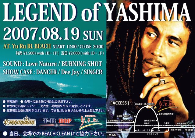 START/12:00-20:00 前売1500YEN(1DRINK.1FOOD) 当日2000YEN(1DRINK.1FOOD) SOUND:Love Nature(Tokushima) BURNING SHOT SHOW: CASE:DANCER Dee Jay SINGER: ※出演者の詳細は近々更新します INFO/ AKIRA(FANTASISTA) http://mixi.jp/show_friend.pl?id=6488213 NARI(T-B HOP) http://mixi.jp/show_friend.pl?id=6072944 備考: ○雨天決行 ○会場への飲食物の持ち込みはご遠慮ください。 ○女性の方の為にシャワー・更衣室 荷物預り所をご用意してます。 ○駐車場は数に限りがございますので で