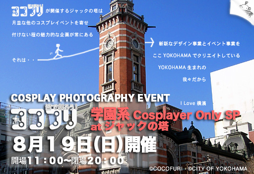 2007年08月19日 (日) 『皆で創ろう!ココフリ 『学園系Cosplayer Only SP』at ジャックの塔(横浜開港記念会館)』 時間:11:00〜20:00 料金:参加料1500円 別途撮影登録料なし 条件:学園系コスプレ、 コスプレイヤーのみ 備考:クローク利用される方はクローク料200円 【撮影会】【女装可】【撮影用小道具OK】 ■8月19日(日)ジャックの塔は『学園系Cosplayer only SP』生徒キャラはもちろん、教職員キャラ、父兄・保護者キャラなど、学園系の漫画・アニメ・ゲーム・小説・映画等のコスプレイ