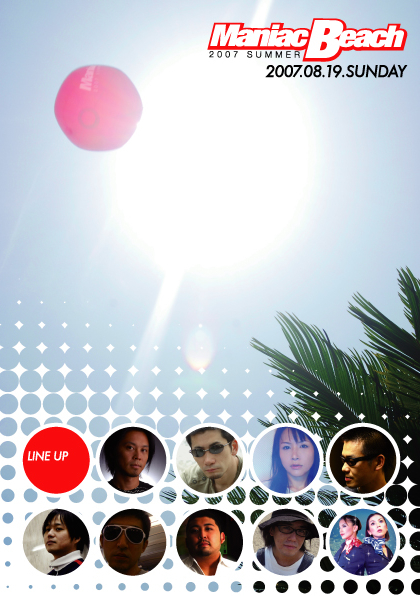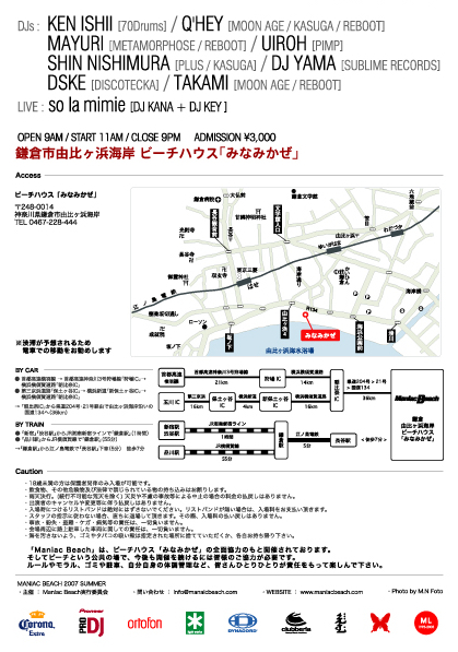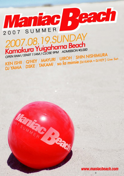 今年で5年目を迎えますます勢いを増す、夏恒例のビーチ・パーティー「Maniac Beach」。 都内から最も近い鎌倉/由比ヶ浜海岸にあるビーチ・ハウス「みなみかぜ」を会場とし、毎年1,000人以上が押し寄せ、ビーチ・パーティーとしては他に類を見ない盛り上がりを見せている。 サンサンと輝く太陽のもと、ビーチという開放的なロケーション、更には豪華出演者によるパフォーマンスで、この夏忘れる事の出来ない思い出となることだろう。 Maniac Beach 2007 2007.08.19.SUNDAY BEACH HOUSE「MINAMI-KAZE」/ YUIGAHAMA, KAMAKURA 鎌倉・由比ヶ浜海