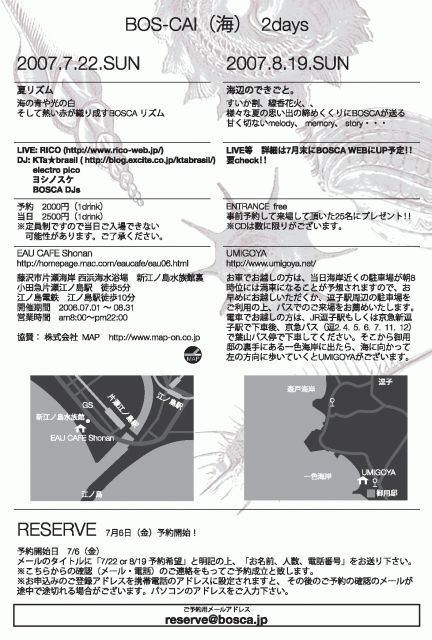 BOSCA-CAI 2days vol.2 「海辺のできごと。」 すいか割、せんこう花火・・ 様々な夏の思い出の締めくくりにBOSCAが送る 甘くせつない melody、memory、story・・・ ■日程 2007年8月19日 [日] ■時間 START 15時〜 LIVE START 17時45分 音止め 20時 ■会場 UMIGOYA http://www.umigoya.net http://mixi.jp/view_community.pl?id=134517 ■料金 entrance free ※事前予約して来場していただいた25名に BOSCAI CDをプ