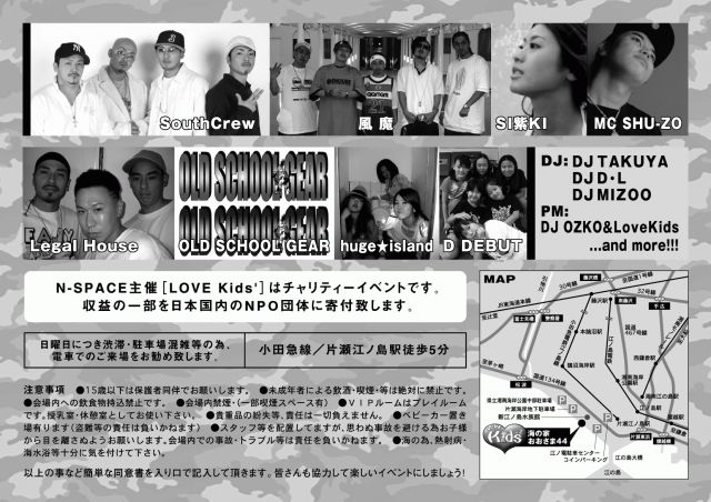 ついに親子のLOVE(愛)を深めるイベント 第2弾が江の島・西浜海の家で開催します。 お子様〜お年寄り・ファミリィー・シングルママ&パパ 独身者・み〜〜んなで楽しいを創りましょうね LOVE Kids vol2 開催日 2007年 8月19日 日曜日 時間 13:00〜19:00 雨天決行・(台風程の天気は中止) 場所 藤沢市片瀬江ノ島・西浜海岸・ 海の家・おおさま44(江の島水族館裏手・少し橋寄り) 大人¥2000 1ドリンク付