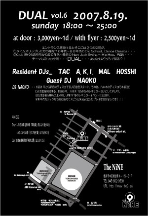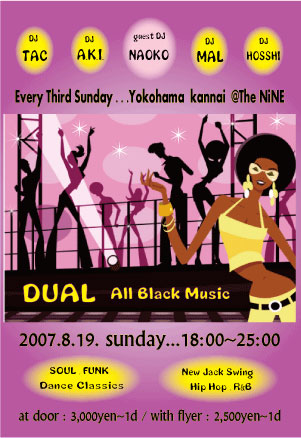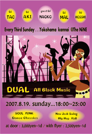 ・・・告知失礼いたします・・・ 毎度ご好評を戴いております横浜・関内@The NiNEの第3日曜日といえばDUAL 8月も19日という想像するだけでもあっつい中 DUALクルー一同、お客様に更にあっつい夜を楽しんでいただこうと燃え滾っております いらした事のある方もない方も是非おこしくださいませ ◆◆◆ DUAL ・ All Black Music ◆◆◆ エントランスを抜けるとそこには2つの空間が。 1: タイムスリップしたかの様な70's〜80's後半のOldSchool、Dan