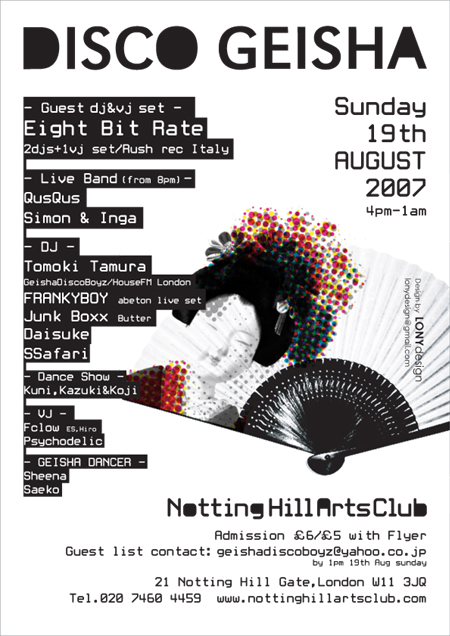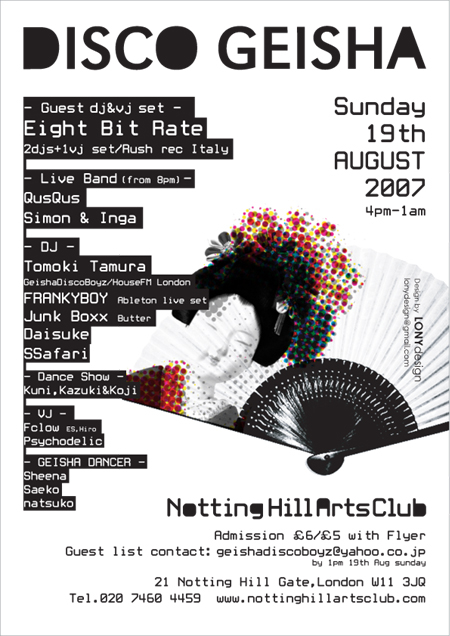 今回はspecial guestとしてイタリアからEight bit rateがロンドン初登場!彼らのnew singleはイビザの神Carl Coxもヘビーplay中です。それに加えLive band,dance show,dj,vj,geisha dancerと様々な要素がmixされたnew style dance music partyです。