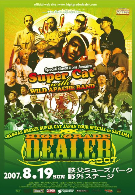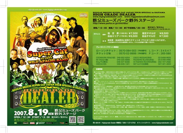 どもー!! お待たせしました!! 8/19の詳細の発表です!!!!!! ”HIGH GRADE DEALER -REGGAE BREEZE SUPER CAT JAPAN TOUR SPECIAL in SAITAMA-” ☆日時 : 8/19 sun 2K7 開場/開演・12:00/13:00〜20:00 ※雨天決行・荒天中止(荒天中止の場合はチケットの払い戻しを致します。) ☆場所 : 秩父ミューズパーク・野外ステージ (http://www.parks.or.jp/chichibu/) ※住所:埼玉県秩父市別所 ※<アクセス> 電車の場合 : 西武「西武秩父駅」または秩父鉄道「秩父駅」 から循環バス「ぐるりん号」乗車 お車の場