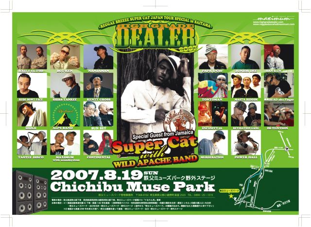 ”HIGH GRADE DEALER -REGGAE BREEZE SUPER CAT JAPAN TOUR SPECIAL in SAITAMA-” ☆日時 : 8/19 sun 2K7 開場/開演・12:00/13:00〜20:00 ※雨天決行・荒天中止(荒天中止の場合はチケットの払い戻しを致します。) ☆場所 : 秩父ミューズパーク・野外ステージ (http://www.parks.or.jp/chichibu/) ※住所:埼玉県秩父市別所 ※<アクセス> 電車の場合 : 西武「西武秩父駅」または秩父鉄道「秩父駅」 から循環バス「ぐるりん号」乗車 お車の場合 : お車の場合 : ※1 関越自動車道花園IC下車 →国道140号