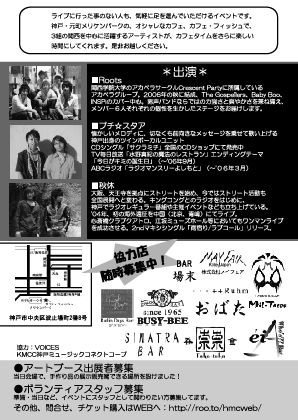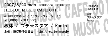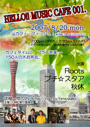 HELLO!! MUSIC CAFE 001. 8/20(月)14時open KOBE元町メリケンパーク「カフェ・フィッシュ!」にて開催! ポップス系インディーズライブイベント カフェタイムに、プラス音楽… 150人の大お茶会。 ●出演 秋休、プチ☆スタア、Roots ●料金 チケット\1,000(別途飲食代\1,000要)予約受付中。 現在ボランティアスタッフ募集。 http://mixi.jp/view_diary.pl?id=509541792&owner_id=176074 一緒に準備してくれる人、告知面、資金面で協力してくれる方やお店、メッセージ下さい。 公式WEB http://roo.to/hmcweb
