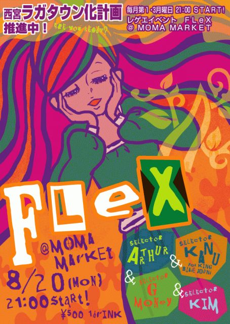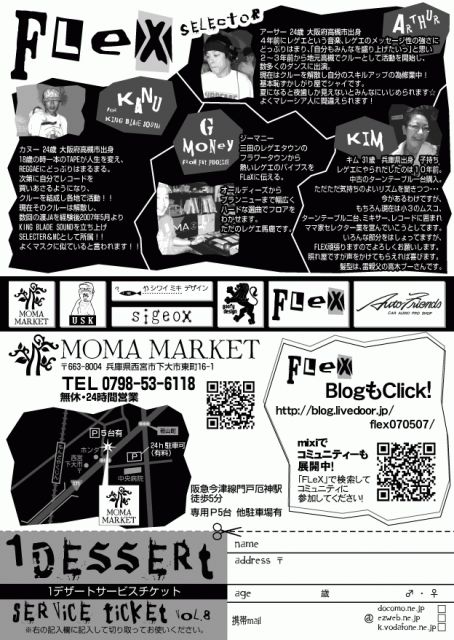 毎回、毎回、レベルアップするFLeX! 前回は過去最高の量のお酒が出たようです! みんな楽しんでくれてます! ええ感じです。 今後も色々楽しいことしようと計画中! いや、マジではやめにFLeXをチェックしておいたほうがいいみたい。 8/20(月)が『お外でFLeX』のスナップ写真販売の最終日になります。 『お外でFLeX』に参加した人は必ずチェックしにきてくださいね! FLeXblog http://blog.livedoor.jp/flex070507/ お外でFLeXMOVIE http://jp.youtube.com/watch?v=xnkDmoe9GjY MOMA MARKET http://mixi.jp/view_commun