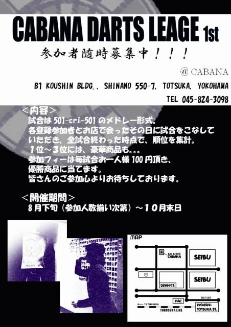 <内容> 試合は501-cri-501のメドレー形式。 各登録参加者とお店で会ったその日に試合をこなして いただき、全試合終わった時点で、順位を集計。 1位〜3位には、豪華商品も。。。 参加フィーは毎試合お一人様100円頂き、 優勝商品に当てます。 皆さんのご参加心よりお待ちしております。 <開催期間> 8月下旬(参加人数揃い次第)〜10月末日 <ポイント> ストレート勝ち:2ポイント 3reg勝ち:1ポイント 負け:−1ポイント 不戦:−2ポイント