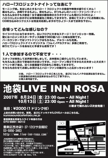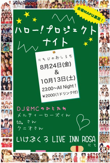 お世話になっております。 夏場のハロ☆ナイは充実の開催を続けて参ります! 各種コンサート、ファンイベントの熱気そのままに、 楽しくパワフルに盛り上げて行きたいと思っておりますので、 是非とも楽しい夜をご一緒致しましょうね! “ハロ☆プロナイトin東京” 日時:8/24(金)23:00〜All Night! ※朝から2次会完備! 会場:池袋LIVE INN ROSA 03-5956-3463 住所:豊島区西池袋1-37-12ロサ会館B2 http://www.live-inn-rosa.com/ 当日:\2000(1d付) ※質問等はクニオ直でお気軽に。 DJ:メルティーローズ/to。/ラフ