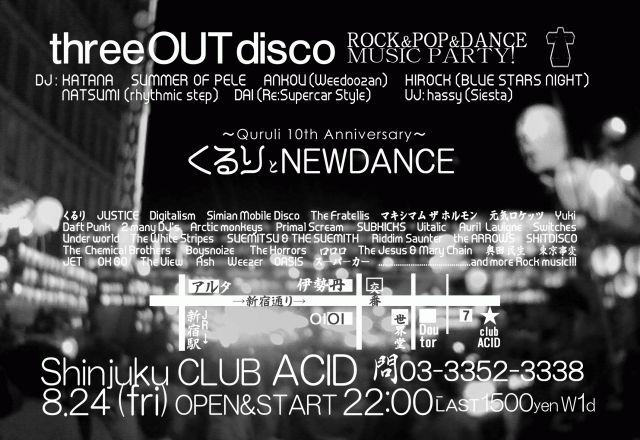 7/14 くるりないと @渋谷Edge End ほんとうにありがとうございました 楽しかったですいやマジで。 出演しないのをわかっていながら、 フジロック、サマーソニックに行って・・・・後はくるりが見たくって。 でも京都音楽博覧会 IN 梅小路公園 は遠すぎて。 チケットは全然とれねーし。 ・・・・というわけでいてもたってもいられず特集イベント、やっぱりやらせて頂くことになりました。 22時から朝4時半というALL NIGHT PARTY。 「くるり」はもちろん、2007年の音楽シーンを盛り上げ