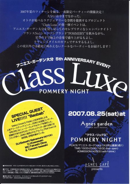 アニエスガーデンで行われる パーティー 2007.08.25(sat)at Agnes sarden TIME:19:00〜23:00(18:00 door open) ADMISSION/¥2500(with 1 drink) Class Luxe(クラス・リュクス) オトナが遊べるラグジュアリーな空間を提供するプロジェクトClass Luxeの第一弾イベント。 パークプレース横のアニエス・ガーデン全体を使っての、セレブリティーなシャンパンナイト。 ■SPECIAL GUEST LIVE!!!!! と言うことでBaobabが出演いたします。 是非、オシャレをしてお越しください。 ■DJ:Satoshi Nakamura(BOYCE) ■VJ:Kawasaki MC