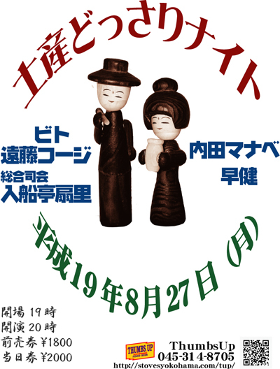久々!土産どっさりです。 出演:ビト/内田マナベ/早健/遠藤コージ 総合司会:入船亭扇里 OPEN19:00/START20:00/ADV¥1800/DOOR¥2000 ウタモノ系個性派シンガーの競演=土産どっさりナイト。真っすぐに届くヒネクレ者達の歌。今回はおなじみの顔ぶれに加え、総合司会に落語界のプリンス入船亭扇里さんをお迎えしてお届けします。