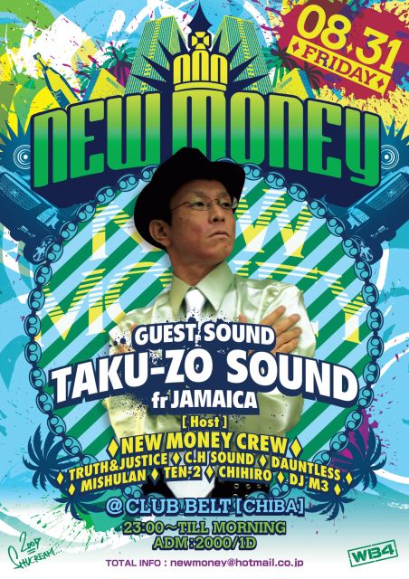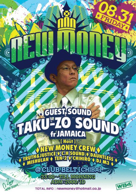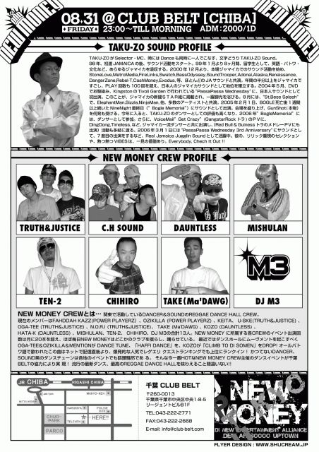8/31(FRI) --NEW MONEY-- @千葉 CLUB BELT 23:00〜TILL MORNING 「GUEST SOUND」 TAKU-ZO SOUND fr JAMAICA 「HOST」 NEW MONEY CREW -Di New Entertainment Alliance- (TRUTH&JUSTICE / C.H SOUND / DAUNTLESS / MISHULAN / TEN-2 / CHIHIRO / DJ M3) ADM:\2000/1DRK 前日までに下記メールアドレス(TOTAL INFO)にメールをもらえればディスカウント可能です。 TOTAL INFO:newmoney@hotmail.co.jp NEW MONEY CREWとは… 関東で活動しているDANCER&SOUNDのREGGAE DANCE HALL CREW。 メンバーはFAHDDA