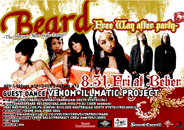 はい! 注目 注目!!! 今週の金曜の夜、皆さんの予定はどうなってますか? 暇な人、クラブ/イベント好きな人、どのイベントに行こうか迷ってる人などなど、色々おられるかと思いますが、そんならまず、このイベントに遊びに来てはどうですか? 特に、DancerやDance好きな方はマジ、要CHECKやと思うで☆ 興味ある方は是非、メッセよろしく♪ 『Beard -The Hottest New Style Party!!- Free Way after party』 @Beber OPEN 22:00〜 ADM :\2000 w1D DOOR:\2500 w1D 【GUEST DANCE】 ・VENOM+ILLMATIC PROJECT 【DJ】