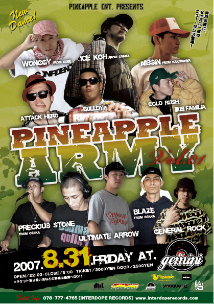 PINEAPPLE ARMY vol.01 2007年8月31日(金曜日) ADV¥2,000 ADM¥2,500 <アーティスト> ICE KOH(大阪) NISSIN(加古川) WONGGY(神戸) BULLDY(神戸) GOLD RUSH(神戸) 原田FAMILIA(神戸) and more... <サウンド> PRECIOUS STONE(大阪) BLAZE(大阪) ULTIMATE ARROW(神戸) GENERAL ROCK(神戸) 神戸の夜にニューダンスが登場! その名も「PINEAPPLE ARMY」! 記念すべき第1回は、ゲストDeeJayに全国ダンスホールレゲエシーンでにおいて若手の中で人気の5月13日にリリースされた『R