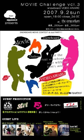 アマチュアチームが作った5分間のスノーボード ショートムービーを、クラブの大きなスクリーンと大音響で、ライブでみんなで見て盛り上がろう!!<br>
