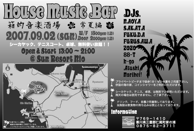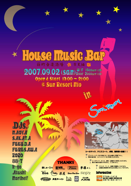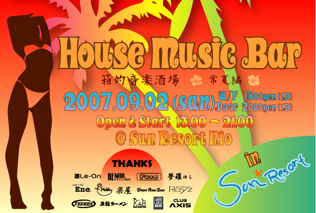 2007.09.02 (sun) House Music Bar vol.3 〜常夏編〜 @Sun Resort Nio http://www.osk.3web.ne.jp/~koyo0001/nio/ Open & Start 13:00 ~ 21:00 W/F 1500yen(1D) Door 2000yen(1D) DJs. NAOYA SAKATA FUKUDA FURUSAWA ZOZO 88-T k-go Atushi Norihei! ■ THANKS ■ CLUB AXIS Hair Make Rayz 楽屋 Shoo Bee Doo Fuse DINING BAR Hobby DELTA MARKET REMIX.STORE Le-On 夢羅 Ene TEDIES 王龍ラーメン K’sB 雨天決行! 徒歩約1分の所