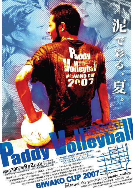 この大会は、青年が主体となって活動し、「どろんこバレーボール」に参加する人も見る人も楽しんでもらうことで守山市全体を活気づけようと企画されました。 昨年の第一回大会は総動員数400名を超える大反響!! 今年はチーム数を拡大!さらなる盛り上がりが予想されます。 ☆…☆…☆…☆…☆…☆…☆…☆…☆…☆…☆…☆…☆…☆…☆ 【Paddy Volleyball BIWAKO CUP 2007】 ―泥で彩る、夏。 ☆★ 参加チーム大募集 ★☆ ■募集チーム数:36チーム(1チーム4〜8名・男女混成化) ■参加費:2500円(保険料込み
