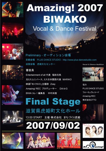 Amazing! 2007 BIWAKO VOCAL&DANCE オーデション開催 本選開催 2007年9月2日(日)午後1時ー 今回の場所はかなりローカルです。都会の真ん中で行うのではなく、自然を感じられる場所です。来年音楽プロデュースで参加する映画のロケ候補地で開催する事にしました。 出場する人たちの順位を決めるのではなく、将来性や可能性をみようという趣旨で、テーマパーク関係者(USJ監督)も審査に加わってもらいます。ボーカル、ダンサーのオーデションですが、映画やテーマパーク、その他のエンターテイメントとしても判断したいと思ってい