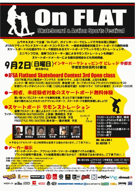 『JFSA 3rd オープンクラス 』 ●開催日:9月2日(日曜日) ●場 所:インターパークビレッジ宇都宮 ●WEBエントリー:1500円 ●当 日エントリー:2000円 混合でGirlsも行います。 ●Girlsエントリー:1000円 方式:60秒1トライ、決勝12名 表彰6名 Girlsは60秒1トライ表彰3名 その他、ベストトリック賞もあり。 ※大会のほかに一般未経験者のスケートボード体験や、観覧者に向けてのスケートボードデモンストレーション、JFSA協賛会社による秋冬その他の展示会もあります。 地図:yahooよ