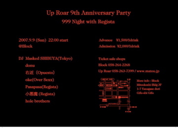 UpRoar9周年Party 999 Night with Regista 2007.9.9(SUN)@Block Ticket Adv ¥1500+1drink/Day ¥2000+1drink オープン 22:00 DJ Masked SHIBUYA(東京) donu 左近(Opuesto) oke(Over Sexx) pasapasa(Regista) 小悪魔(Regista) Ticket sale Shop Block 058-264-2268 UpRoar 058-263-7399 / www.matou.jp In