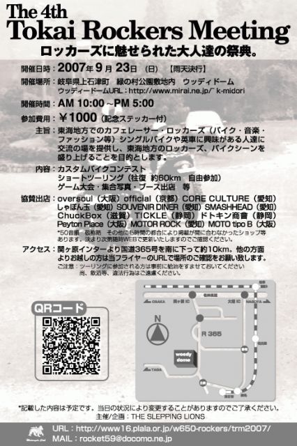 告知失礼致します! 9月23日(日)に岐阜県の緑の村公園”ウッディードーム”にて”The 4th TOKAI ROCKERS MEETING”を開催致します。 昨年は天候が残念ながら雨…にも関わらず80人以上の参加者に恵まれ大成功でした!感謝! 昨年の様子です☆ http://www16.plala.or.jp/w650-rockers/061001.html ウッディードームは広々とした敷地で、とてもいい場所です!! 駐車スペースに並んだ単車を眺めながらの単車談義、ショートツーリングでは気持ちの良いコースを皆で走る! ドーム内では協賛店様のお店でお買い物、ゲーム大会等々。 絶対