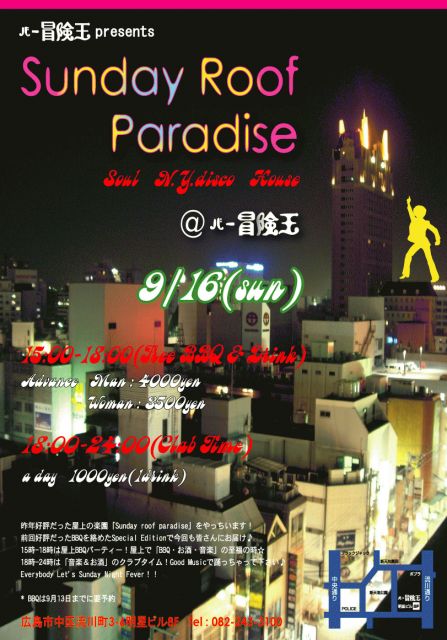 まいど〜dragonでっす! ゴールデンウィークに好評だった屋上の楽園「Sunday roof paradise feat.BBQ」を9月16日(祝前日曜)にやっちゃいます! 今回もバーベキューを絡めてのspecial editionでお届けします! 野外で「Soul、N.Y.disco、House」を聴きながらのバーベキューとお酒は本気でハマリ過ぎ!! 年内最後の「屋上パーティー」となりますので、前回来た方も前回来そびれた方も、皆さんお友達をお誘い合わせの上、是非お越し下さい。 お待ちしておりまっす♪ 場所:バー冒険王屋上 日時:9月16日(祝前日曜)