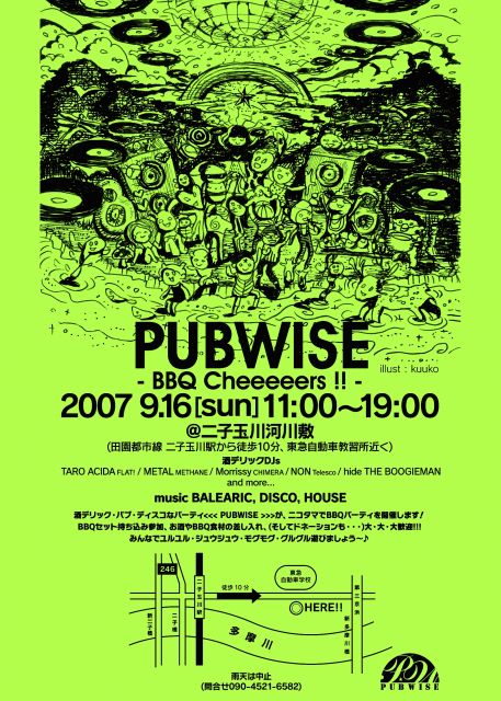 <<< PUBWISE >>> - BBQ Cheeeeers !! - ■9/16(日) ■11時始め〜19時終り ■二子玉川河川敷 (田園都市線 二子玉川駅から徒歩10分、東急自動車教習所近く) http://map.yahoo.co.jp/pl?lat=35.36.11.221&lon=139.38.10.895&sc=3&mode=map&type=scroll ■雨天は中止(問合せ09045216582) ■酒デリックDJs: TARO ACIDA(FLAT!), METAL(METHANE), Morrissy(CHIMERA), MUTO aka むとちん.com(COSMIC SLOP), NON(Telesco), hide THE BOOGIEMAN [music:BALEARIC, DISCO, HOUSE] 酒デリック・パブ・ディスコなパー