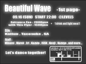 ○Beautiful Wave -1st page- ○9/16 (Snuday) @LEVEL5 Kiryu Gunma ○OPEN 22:00 ○DJs Kattun , Tacosuke , SA ○Music House, Dance Classics, and more... ○STAFF Minami , Marek , Eri , Kazuto , ISSK , Kenji , Kazuya , and more... ○with flyer:1500yen -1drink and light meal- without:2000yen -1drink and light meal- Let's dance together!!! よろしくお願いします☆