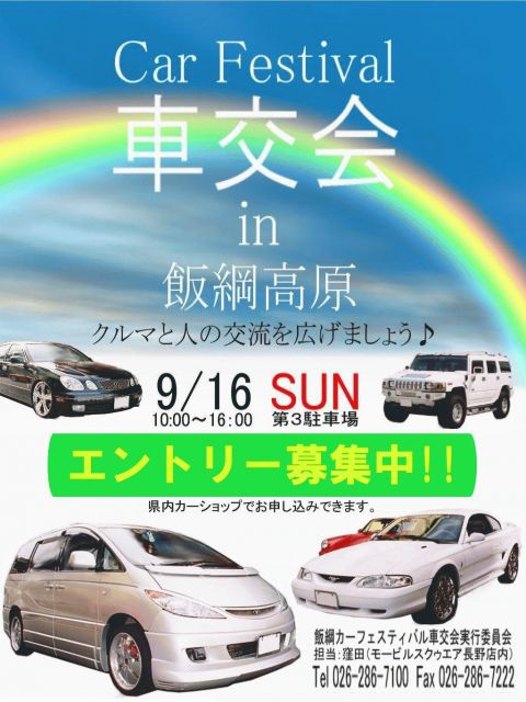 車交会は、クルマが好きな人たちが誰でも楽しく参加できるイベントを目指しています。早く走るチューニングも、見せる聴かせるオーディオも、ドレスアップも、クルマが好きな人たちが楽しく過ごせる交流会をつくります。「クルマが好き」という気持ちはみんな一緒。そんな人たちが集まれたら楽しいイベントになると思います。 実行委員長 窪田賢一(モービルスクゥエア) 【開催日】平成19年9月16日 AM10:00〜PM4:00 【場所】飯綱高原スキー場 弟3駐車場 【エントリー方法】 長野県(東北信)のお近くのカ