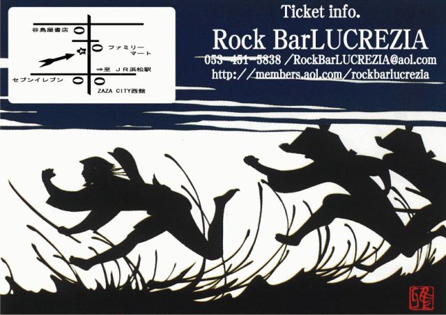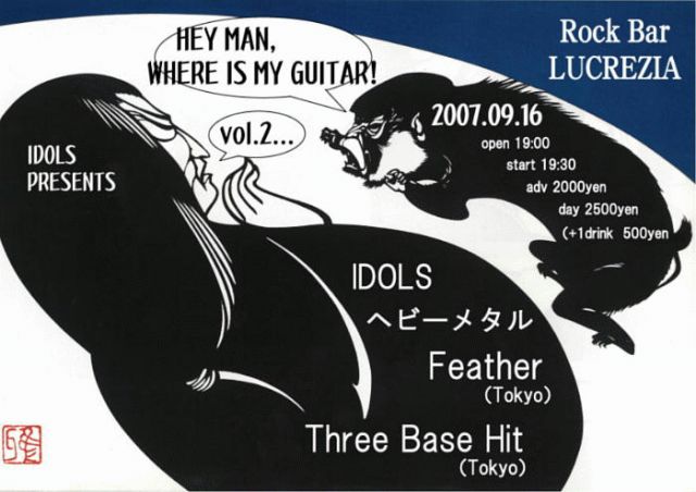 告知失礼いたします。 2007年09月16日(日) ROCK BAR LUCREZIA (浜松) ◆ IDOLS PRESENTS/ HEY MAN, WHERE IS MY GUITAR? vol.2 ◆ 【出演バンド】 ★ Three Base Hit (tokyo) http://www4.plala.or.jp/teisco/index.html ★Feather(tokyo) http://homepage2.nifty.com/feather6672/index.html#menu ★ヘビーメタル ★IDOLS http://soalones.blog42.fc2.com/ 【Dee Jay】 ☆nicoletti (IDOLS) ☆ ........ ●OPEN 19:00/ START 19:30 ●ADV 2000 (+1drink 500) /Door 2500 (