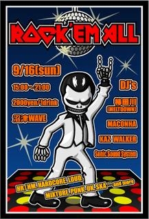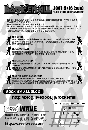 ROCK 'EM ALLではジャンルの壁を越え、良質な音楽を新旧・洋邦問わず爆音でかけるDJイベントです。 最新の楽曲から、懐かしいあの名曲まで! 踊ったりモッシュ&ダイブするもよし!お酒を飲みながら話すもよし!楽しみ方は自由です。 ライブだけではもの足りない人や、音楽仲間を増やしたい人など、ROCK 'EM ALLではそんな方々のご来場を心からお待ちしております。 2007/9/16(SUN) 15:00-21:00 \2000/1drink DJ's:柿田川(MELTDOWN) / MACONHA / KAZ WALKER / Sonic Sound System http://blog.livedoor.jp/rockemall 今回