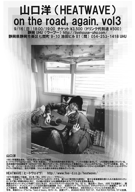 9/16(日) 18:00/19:00 山口洋(HEATWAVE) ソロツアー『on the road,again vol.3』 チケット\3,500(ドリンク代別途\500) 静岡 UHU(ウーフー) http://livehouse-uhu.com/ 静岡県静岡市葵区七間町9-10 池田ビルB1 (問)054-253-1418 UHU フジロック07に出演したHEATWAVE(ヒートウェイヴ)山口洋さんのソロライブです。 静岡市でのライブは1998年以来の9年ぶりです。 UHUの1周年の日に、ボクの世界一好きなバンドのボーカリストのソロライブがUHUであるなんて夢のようです。 HEATWAVE http://www.five-d.co.jp/heatwave/ FUJIROCK