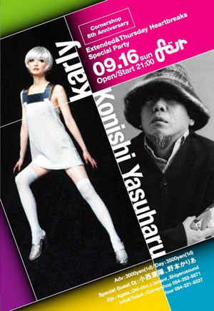 静岡のオシャレらくだレコード店「CORNERSHOP」の8周年記念パーティーに小西康陽さんと野本かりあさんがやって来ます。 3連休の人も仕事の人も、連休にアクセントをつけるパーティーに遊びに来てください。 Extended&THB Special Party "Cornershop 8th Anniversary"@four 2007,09,16(sun)21:00 open/start Adv:¥3,000(1d)/ Day: ¥3,500(1d) Special Guest Dj: 小西康陽、野本かりあ Djs: Agata, Oki-chu, L'amant, Shigerusound http://www.cornershoprecords.com/
