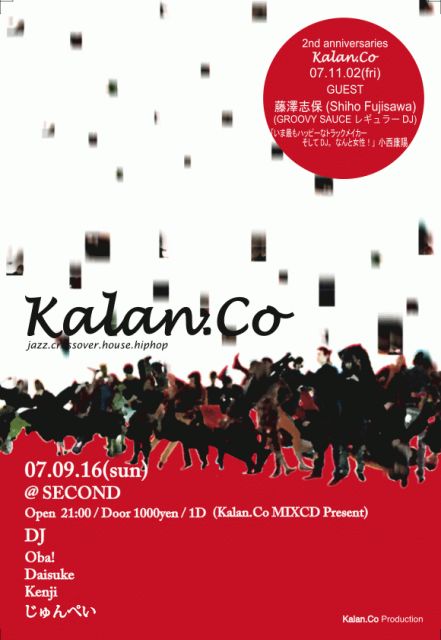 音楽が好きな方お酒の好きな方 是非是非いらしてください〜 夏は終わってしまいましたが、これからの季節は 音楽の秋、お酒の秋、Kalan.Coの秋です みんなで楽しく呑みましょう □■□■□■□■□■□■□■□■□■□■□■□■ Kalan.Co jazz crossover house hiphop @second 2007.09.16 SUN open 21:00〜 Door 1000yen/1d DJ's oba! daisuke kenji じゅんぺい @second----- http://www.r-rec.com/2/ そして、さらに2ヶ月後、11月2日には 2周年を迎えるため、スペシャリーな