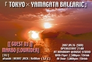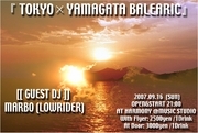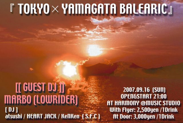 管理人様、告知失礼致します。 ○●○●○ J BALEARIC TOUR 2007 ○●○●○ 高崎WOAL、新潟PRAHA、ホテル・ニューオータニ に続いての開催です。 『TOKYO×YAMAGATA BALEARIC』 2007.09.16(SUN) OPEN&START 21:00 AT HARMONY@MUSIC STUDIO http://mixi.jp/view_community.pl?id=836819 GUEST DJ: MARBO(LOWRIDER) www.star-lowrider.com http://mixi.jp/view_community.pl?id=82100 DJ: atsushi&HEART JACK&KeNKen With Flyer: 2500yen /1Drink At Door: 3000yen /1Drink