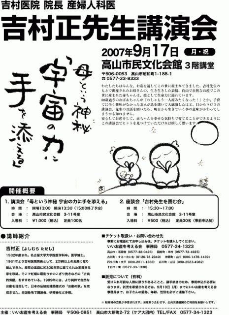 吉村医院 院長 産婦人科医 吉村正先生講演会 「母という神秘 宇宙の力に手を添える」 2007年9月17日 月・祝 高山市民文化会館 3階講堂 わたしたちはみんな、お産を通してこの世に産まれてきました。吉村先生のもとで出産されたお母さんの、生き生きした表情、自由で自然なお産でこの世に産まれた赤ちゃんは、凛として生命力に溢れています。 80歳過ぎのおばあちゃんが「わしゃもう一人産みたくなった!」とか、子育てに全く興味がなかった友人が話を聞いて大感激したほど、目からウロコの講演会、先生のお話を聞いたら、明日から