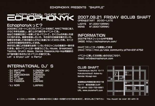 2007年9月21日(金) ECHOPHONYK INTERNATIONAL DANCE PARTY presents "SHUFFLE" START 20:00〜late @CLUB SHAFT 女性1,000円(1Dri) 男性1,500円(1Dri) 【Echophonykってなに?】 2000 年にスタートしたクラブイベントの名称で,今年で7年目に突入!さらに今年も成長し、盛り上がり続けるイベントです。仙台での国際交流に一役買ってるイベ ントで、たくさんの外国人も遊びに訪れます。英語を勉強したい方、今の流行の音楽を聴きたい方、国際交流を通して他の国の人たちと友達になってみたい方 等、たくさんの方々の参加をお待ちしてます