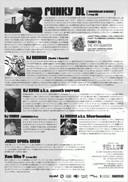 ジャジー&メロウなサウンドで全世界のヒップホップ・ヘッズから絶大な支持を得ているFUNKY DLの待望の再来日公演が決定!最新アルバム「THE 4TH QUARTER」のリリースを記念して、メインフロアにDJ NOZAWA, DJ RYOW、そして、B1FスペースにはJAZZY SPORT CREWとUKの謎のエディット・マスターYAM WHO ? が参戦決定!