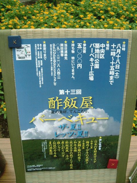 新富町の寿司職人「酢飯屋」さんが またまた、スペシャルBBQを開きます。 今回のテーマは『静岡』 既に沼津、箱根、伊豆、富士、由比、清水、焼津、御前崎、浜松と 各地を周って美味しい物をみっけたらしいです♪ 今回のメニューはこちら ・桜海老サラダ ・沼津の干物 ・御前崎産カツオ刺し ・冷やし静岡おでん ・あしたか牛 ・ルイビ豚(トン) ・富士宮焼きそば ・銀シャリ ・しらすアイス ・静岡の地酒 【日時】 9月22日 (土) 11時〜15時まで 【場所】 東京都 中央区 築地川公園バーベキュー