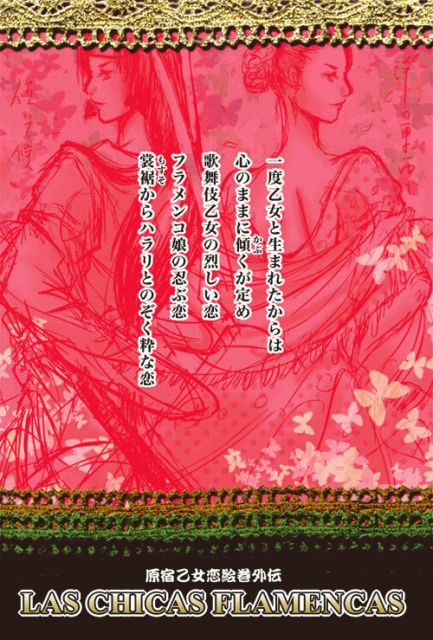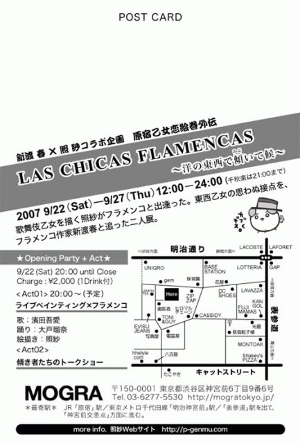 新渡春×照紗コラボ企画 原宿乙女恋絵巻外伝 『LAS CHICAS FLAMENCAS (ラス・チーカス・フラメンカス:傾く乙女)』 〜洋の東西で傾(かぶ)いて候〜 日程:2007年9月22日(土)〜27日(木) 時間:12:00〜24:00(初日は20:00開場・千秋楽は21:00まで) 会場:MOGRA (http://mogra-tokyo.jp/) (入場無料) ★初日は20時開場オープニングパーティーあり (詳細は下記をご参照ください。) 歌舞伎乙女を描きつづけるモノツクリ照紗がフラメンコと出逢った。東西乙女の思わぬ接点を、フラメンコ小説の書き手新渡春とともに解き明かす二人展