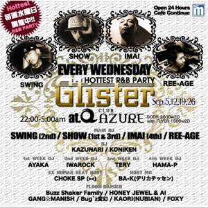 告知失礼します☆ 毎週水曜日、大阪CLUB AZUREにて開催中の【Glister】!!! 平日にも関わらず、毎週250人ものお客さんに足を運んでいただいています!! 大阪ミナミを代表するR&BのPARTYと言っても間違いなし!! 皆さんぜひ一度遊びに来てください!!!!! 毎週水曜日 9月/5日、12日、19日、26日 【 GLISTER】@大阪CLUB AZURE - GLISTER CM - http://www.youtube.com/watch?v=YIAS8v4O6lU 22:00-05:00 Door/2000yen-W2D with FLYER/1500yen-2D - MAIN DJ - SWING[2nd] /SHOW[1st]/ IMAI
