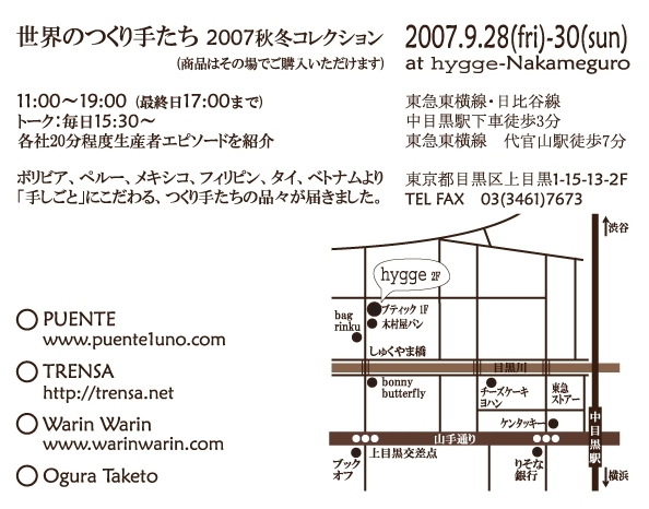 ∞∞∞∞∞∞∞∞∞∞∞∞∞∞∞∞∞∞∞∞∞∞∞∞∞∞∞ 世界のつくり手たち 2007秋冬コレクション のご案内 2007.09.28(Fri) - 09.30(Sun) @ hygge 中目黒 http://trensa.net/event0907 ∞∞∞∞∞∞∞∞∞∞∞∞∞∞∞∞∞∞∞∞∞∞∞∞∞∞∞ この度、東南アジア、中南米で、現地の人たちと共にものづくりに取り組んでいる私たち4社は、中目黒のカェ&ギャラリー『hygge』にて、合同展示販売会を催すことになりました。 現地の人たちと親しくなればなるほど、世界には私たちの知らな