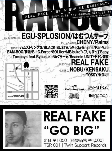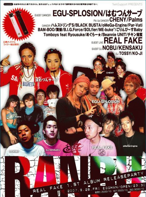 TwinSupport PRESENTS 『乱舞』〜第十八幕〜 2007 9/28 (FRI) @渋谷eggman OPEN 23:30 REAL FAKE 1st ALBUM REREASE PARTY ☆GUEST DANCER☆ 【はむつんサーブ】 【EGU-SPLOSION】 ★PICK UP DANCER★ 【CHENY】 【Palms】 ☆DANCER☆ oMeGa-Engine BAM-BOO ごりんぴ〜すBaby チキン南蛮 Beannie UNIT めぐらー★ 舞娘 Tomboys feat Ryosuke ME-buke" SOLfier B.I.G.Force Psr-Vati BLACK BU$TA ハムストリング's ★GUEST LIVE★ 【REAL FAKE】 ☆GUEST DJ☆ 【DJ NOBU】